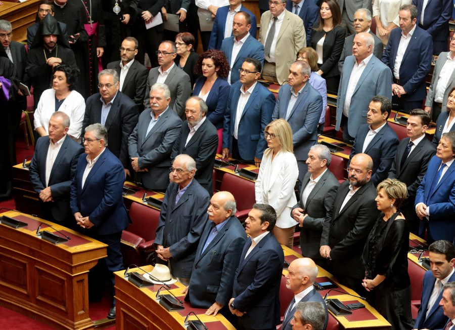 Ο κ. Παπανδρέου κάθισε τελικά δίπλα από τον Αλέξη Τσίπρα, με τον οποίο μάλιστα είχαν και μια θερμή χειραψία.Πρώτα, πραγματοποιήθηκε η ορκωμοσία με θρησκευτικό όρκο της συντριπτικής πλειοψηφίας των βουλευτών της Ν.Δ, του ΚΙΝΑΛ και της Ελληνικής Λύσης, με την εξαίρεση της Φωτεινής Πιπιλής και του Γιώργου Παπανδρέου. Τον καθιερωμένο αγιασμό και την ορκωμοσία τέλεσε ο Αρχιεπίσκοπος Αθηνών και Πάσης Ελλάδος, Ιερώνυμος, μαζί με τα μέλη της Ιεράς Συνόδου.