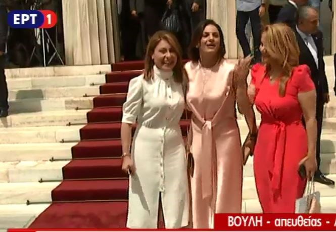 Αρκετές ήταν οι παρουσίες που εντυπωσίασαν κατά τη διάρκεια της ορκωμοσίας. Η Νόνη Δούνια τράβηξε τα βλέμματα, καθώς φορούσε ένα λιτό μοβ σύνολο, πουκάμισο με παντελόνι το οποίο συνόδευε με κίτρινη τσάντα- φάκελο ενώ είχε τα μαλλιά της πιασμένα ψηλά σε αυστηρό σινιόν.