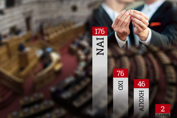 Με ευρεία πλειοψηφία 176 ψήφων «πέρασε» το νομοσχέδιο για τα ομόφυλα ζευγάρια. «Όχι» ψήφισαν 76, 2 επέλεξαν «παρών, ενώ υπήρξαν 46 αποχές.