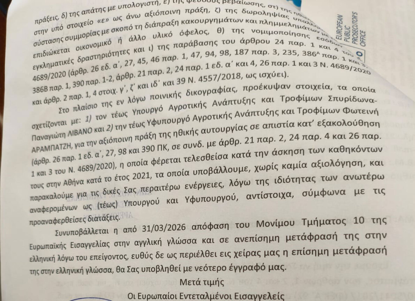 Στο πρώτο διαβιβαστικό που αφορά τη δικογραφία για Παναγιώτη Λιβανό και την Φωτεινή Αραμπατζή, αναφέρεται: «Στο πλαίσιο της εν λόγω ποινικής δικογραφίας, προέκυψαν στοιχεία, τα οποία σχετίζονται με: 1) τον τέως Υπουργό Αγροτικής Ανάπτυξης και Τροφίμων Σπυρίδωνα – Παναγιώτη Λιβανό 2) την τέως Υφυπουργό Αγροτικής Ανάπτυξης και Τροφίμων Φωτεινή Αραμπατζή, για την αξιόποινη πράξη της ηθικής αυτουργίας σε απιστία κατ’ εξακολούθηση, η οποία φέρεται τελεσθείσα κατά την άσκηση των καθηκόντων τους στην Αθήνα κατά το έτος 2021, τα οποία υποβάλλουμε χωρίς καμία αξιολόγηση και παρακαλούμε για τις δικές σας περαιτέρω ενέργειες, λόγω της ιδιότητας των ανωτέρω αναφερόμενων ως (τεως) Υπουργού και Υφυπουργού αντίστοιχα σύμφωνα με τις προαναφερθείσες διατάξεις».