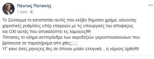 “Το Σύνταγμα το καταπατάει αυτός που κλέβει δημόσιο χρήμα, κάνοντας χαριστικές ρυθμίσεις υπέρ εταιρειών με τις υπουργικές του αποφάσεις και ΟΧΙ αυτός που ανακαλύπτει τις λαμογιές!!! Τόπιασες το νόημα αντιπρόεδρε των ακροδεξιών γκρουπουσκουλων που βρίσκεσαι σε παραλήρημα από χθες;;;;; ΥΓ κάνε όσες μηνύσεις θες σε όποιον μιλάει ελληνικά… η νέμεσις ήρθε!!!!”
