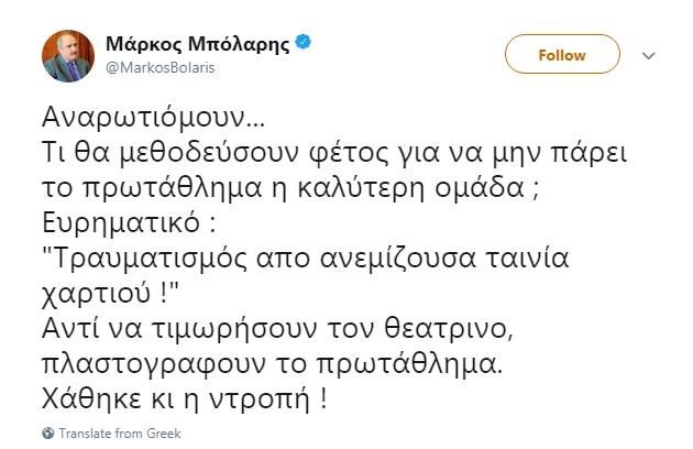 Την δική του διάσταση για την τιμωρία του ΠΑΟΚ έδωσε μέσα από τον λογαριασμό του στο twitter, ο βουλευτής του ΣΥΡΙΖΑ Μάρκος Μπόλαρης.