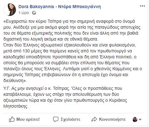Αναλυτικά η ανάρτηση της Ντόρας Μπακογιάννη στο Facebook: