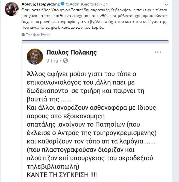 “Θαυμάστε ήθος Υπουργού Σοσιαλδημοκρατικής Κυβερνήσεως που ειρωνεύεται μια γυναίκα που έπαθε ένα ατύχημα και κινδύνευσε μάλιστα, χρησιμοποιώντας άσχετη περσινή φωτογραφία, για να βγάλει το άχτι του κατά του συζύγου της. Που είναι το τμήμα δικαιωμάτων του Σύριζα;”.
