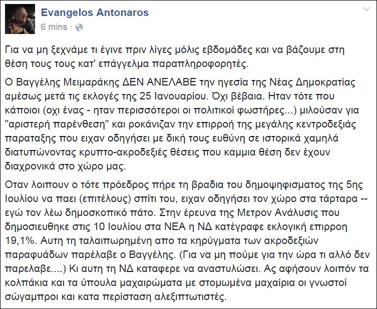 «Αυτή τη ταλαιπωρημένη από τα κηρύγματα των ακροδεξιών παραφυάδων παρέλαβε ο Βαγγέλης. (Για να μη πούμε για την ώρα τι άλλο δεν παρέλαβε….) Κι αυτή τη ΝΔ κατάφερε να αναστυλώσει. Ας αφήσουν λοιπόν τα κολπάκια και τα ύπουλα μαχαιρώματα με στομωμένα μαχαίρια οι γνωστοί σώγαμπροι και κατά περίσταση αλεξιπτωτιστές» έγραψε χαρακτηριστικά στον προσωπικό του λογαριασμό στο Facebook ο κ. Αντώνταρος.
