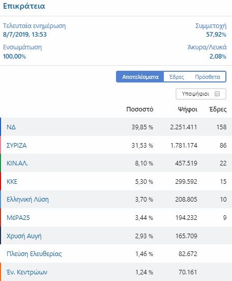 ΝΔ: 39,85% και 158 έδρες
