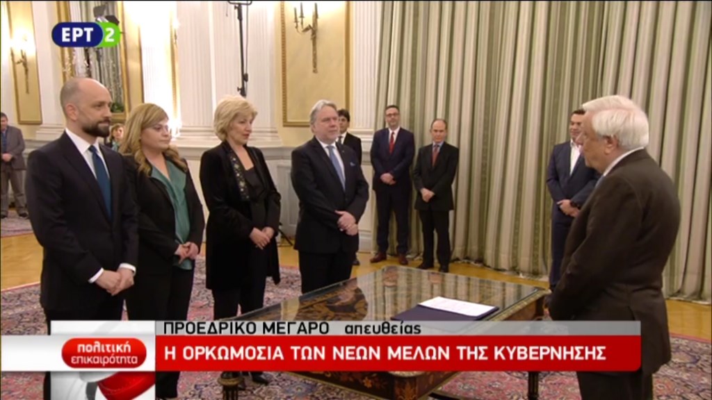 Ενώπιον του Προέδρου της Δημοκρατίας Προκόπη Παυλοπούλου και παρουσία του Πρωθυπουργού Αλέξη Τσίπρα, ορκίστηκαν, με θρησκευτικό όρκο, από τον Επίσκοπο Μεθώνης κ. Κλήμη ο Θάνος Μωραΐτης, ως Υφυπουργός Υποδομών και Μεταφορών και ο Άγγελος Τόλκας, ως Υφυπουργός Μεταναστευτικής Πολιτικής.