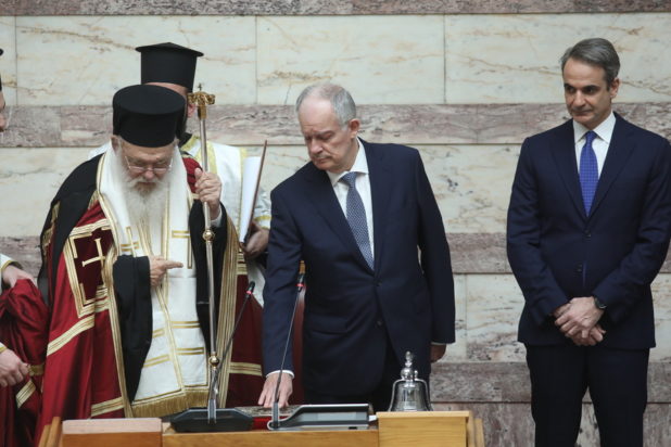 Ορκίστηκε Πρόεδρος της Δημοκρατίας ο Κωνσταντίνος Τασούλας. Αφού φίλησε το χέρι του Αρχιεπίσκοπου Ιερώνυμου, ο κ. Τασούλας έβαλε το χέρι του στο Ιερό Ευαγγέλιο και είπε τον όρκο που αναφέρει: