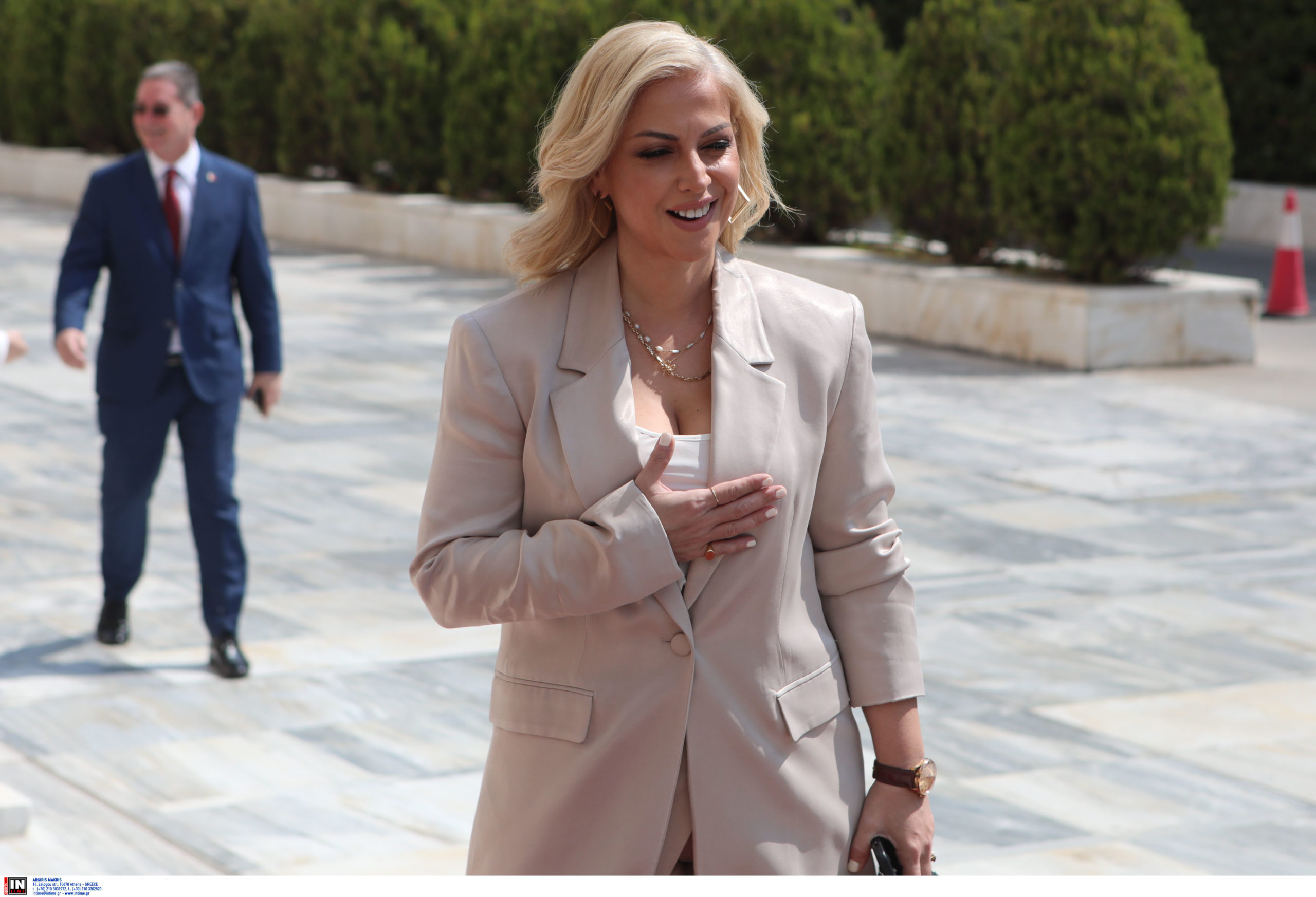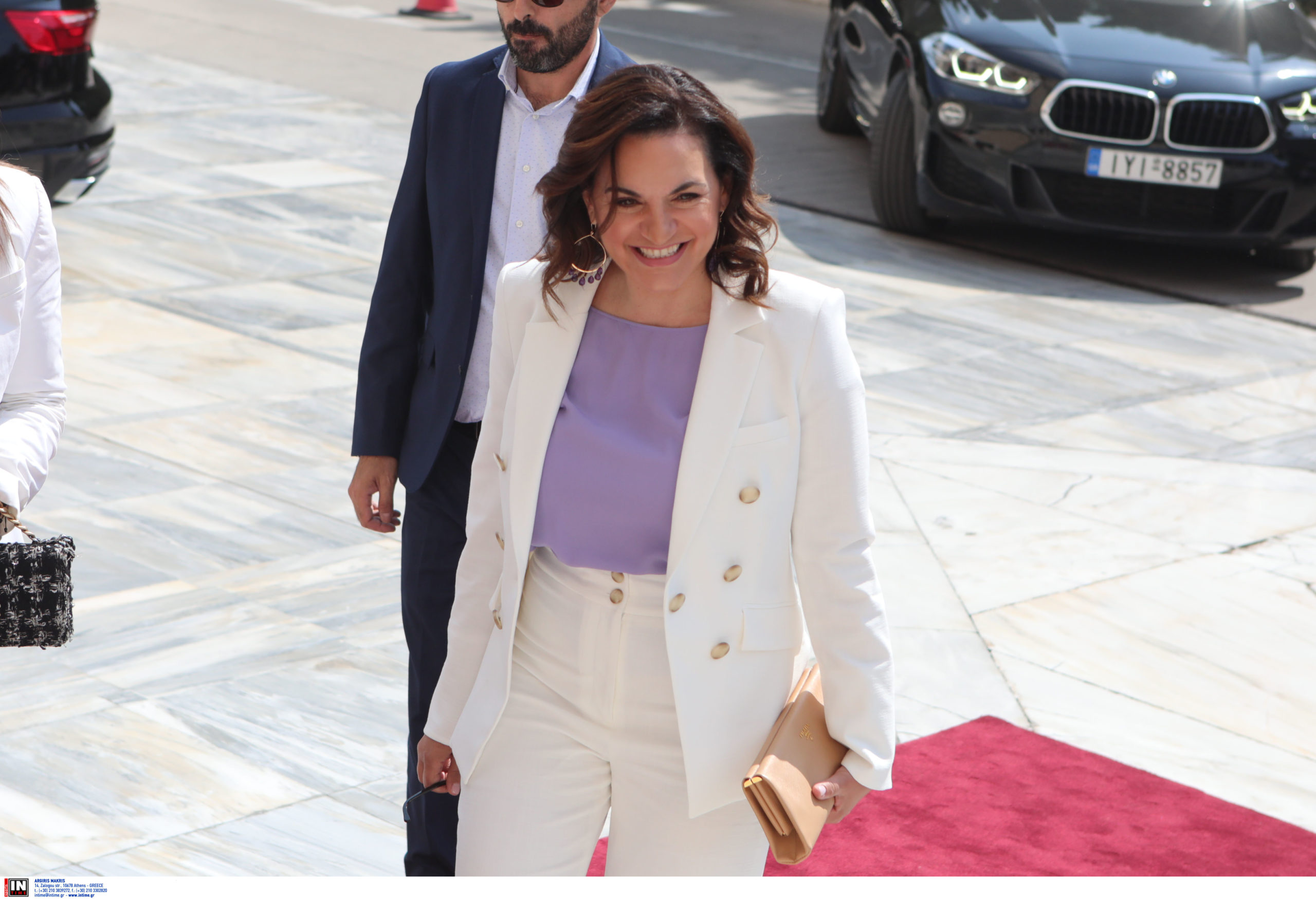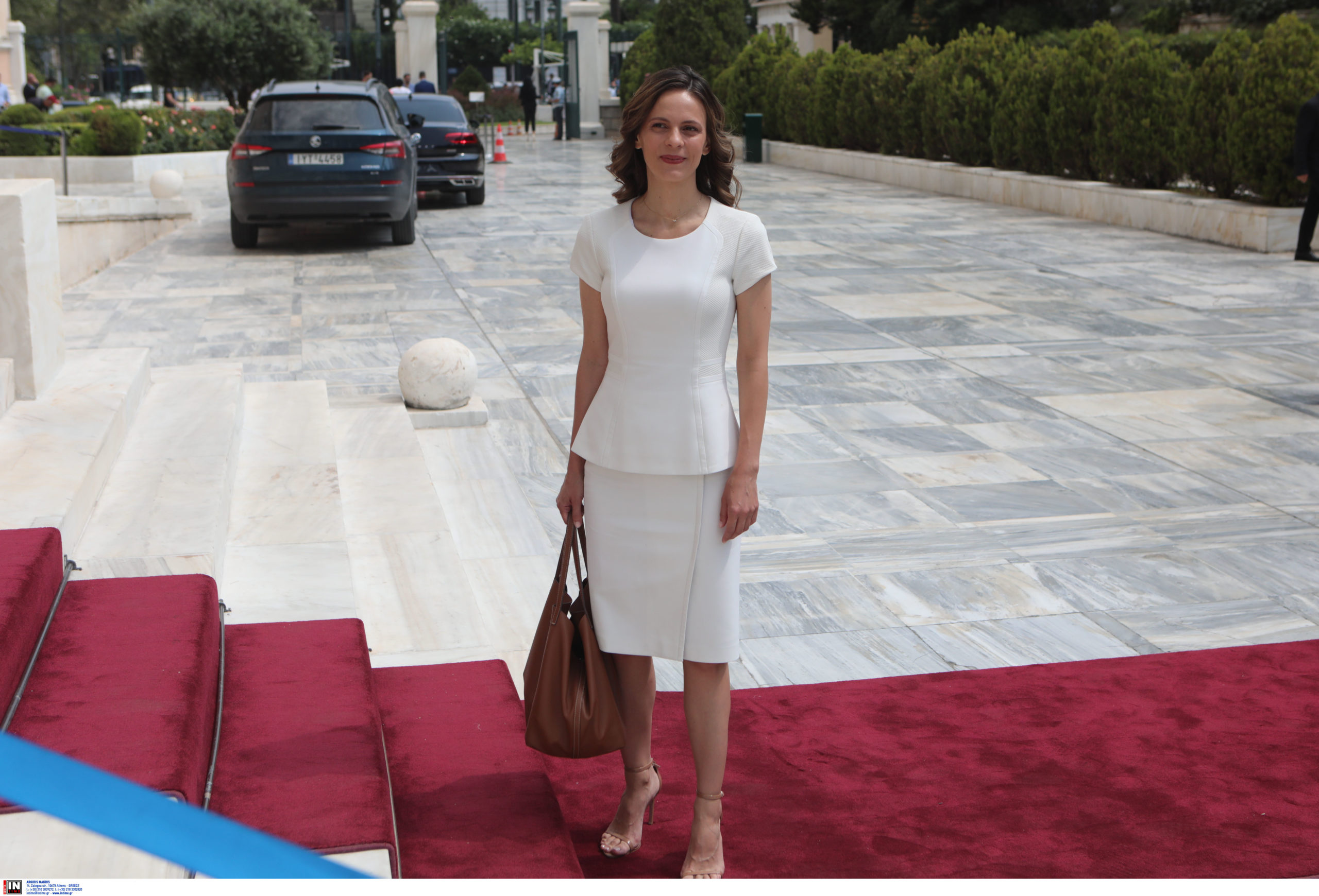 Η Έφη Αχτσιόγλου, παρά το γεγονός ότι ήταν η τελευταία που έφτασε στη Βουλή, επέλεξε ένα λευκό, κομψό ταγιέρ με ψηλοτάκουνα μπεζ πέδιλα.