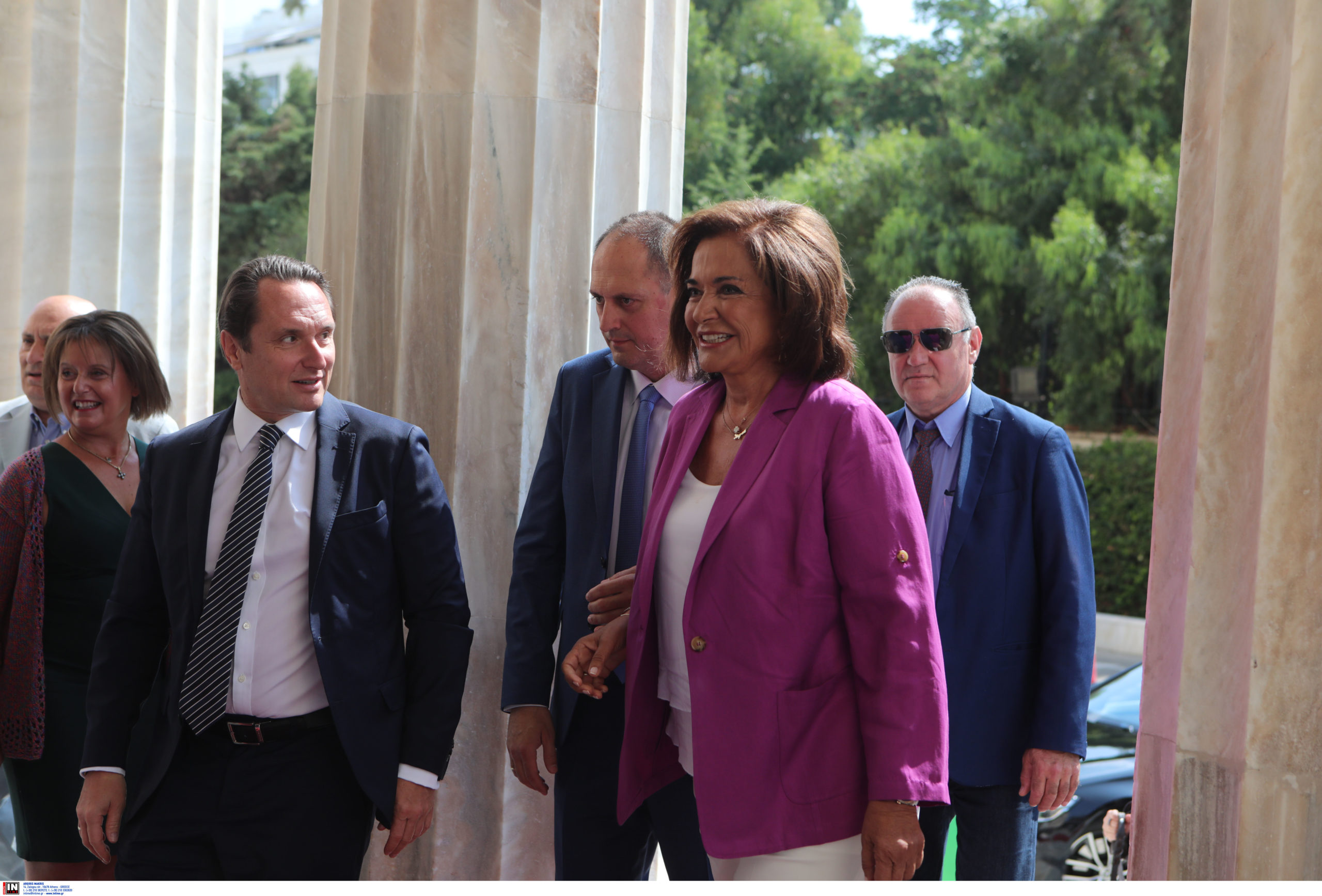 Το πιο εντυπωσιακό χρώμα του καλοκαιριού επέλεξε η Ντόρα Μπακογιάννη, με το μωβ σακάκι της, που συνδύασε με λευκό μπλουζάκι και παντελόνι.