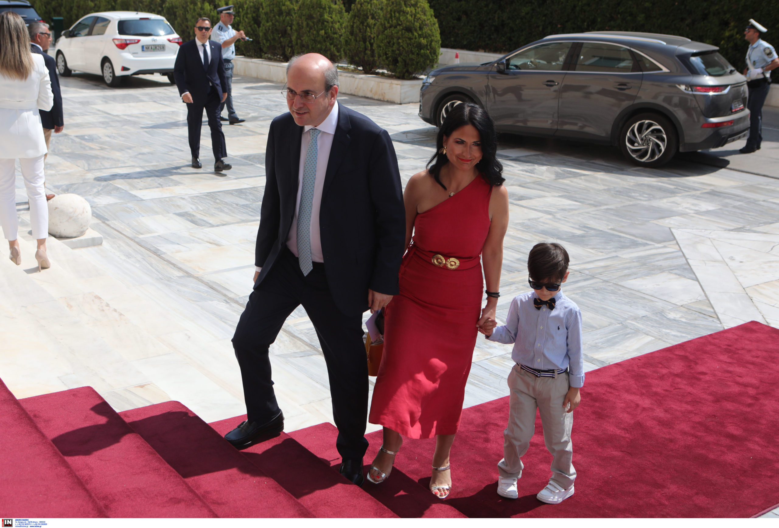 Η σύζυγος του Κωστή Χατζηδάκη, Πόπη Καλαϊτζη, επέλεξε ένα φούξια φόρεμα με ακάλυπτο τον έναν ώμο, ενώ ο γιος τους ήταν αυτός που κέρδισε όλες τις καρδιές με το χαριτωμένο παπιγιόν και τα μοδάτα γυαλιά ηλίου.