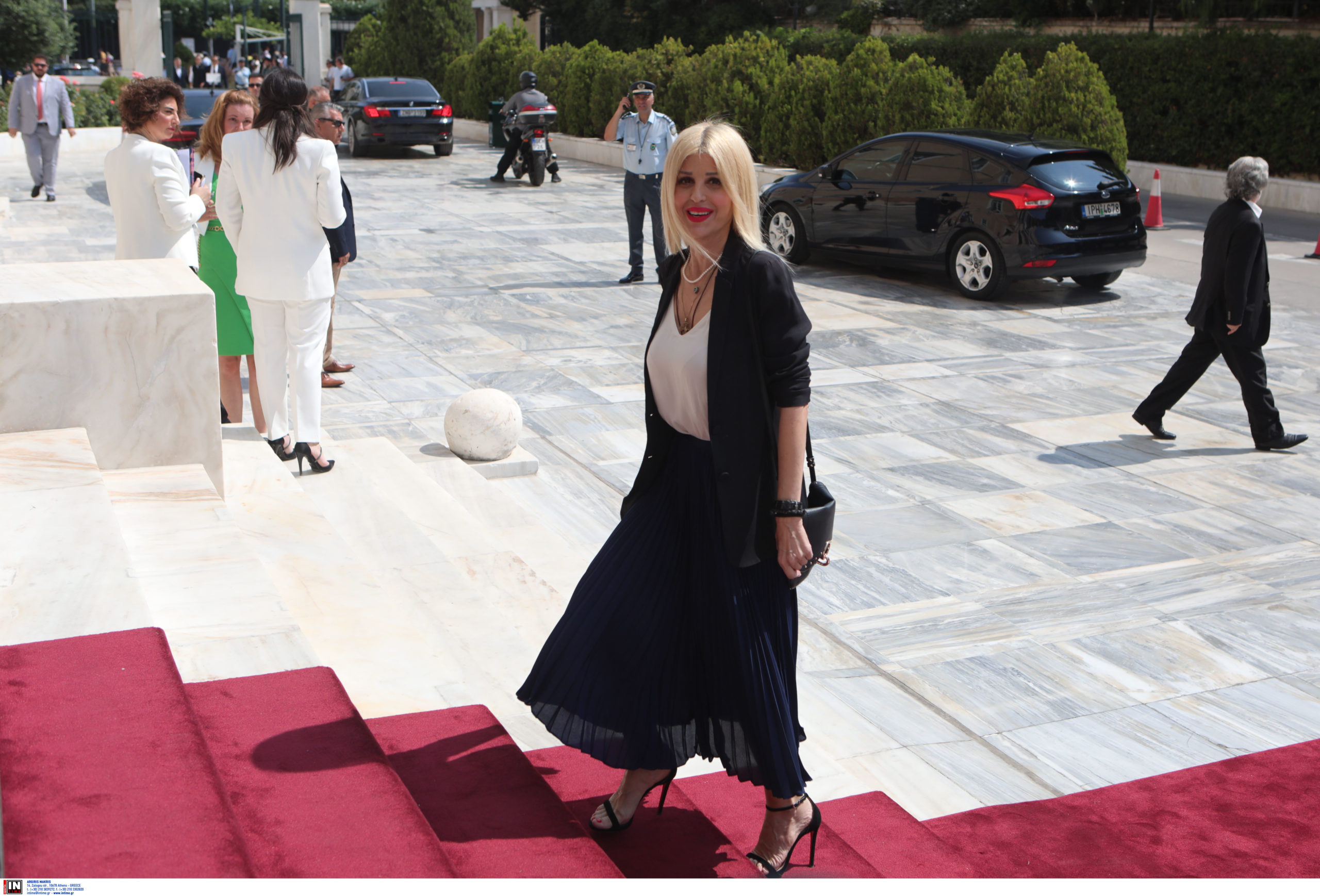Η Έλενα Ράπτη, επέλεξε μια πλισέ μπλε φούστα και ψηλοτάκουνα πέδιλα.
