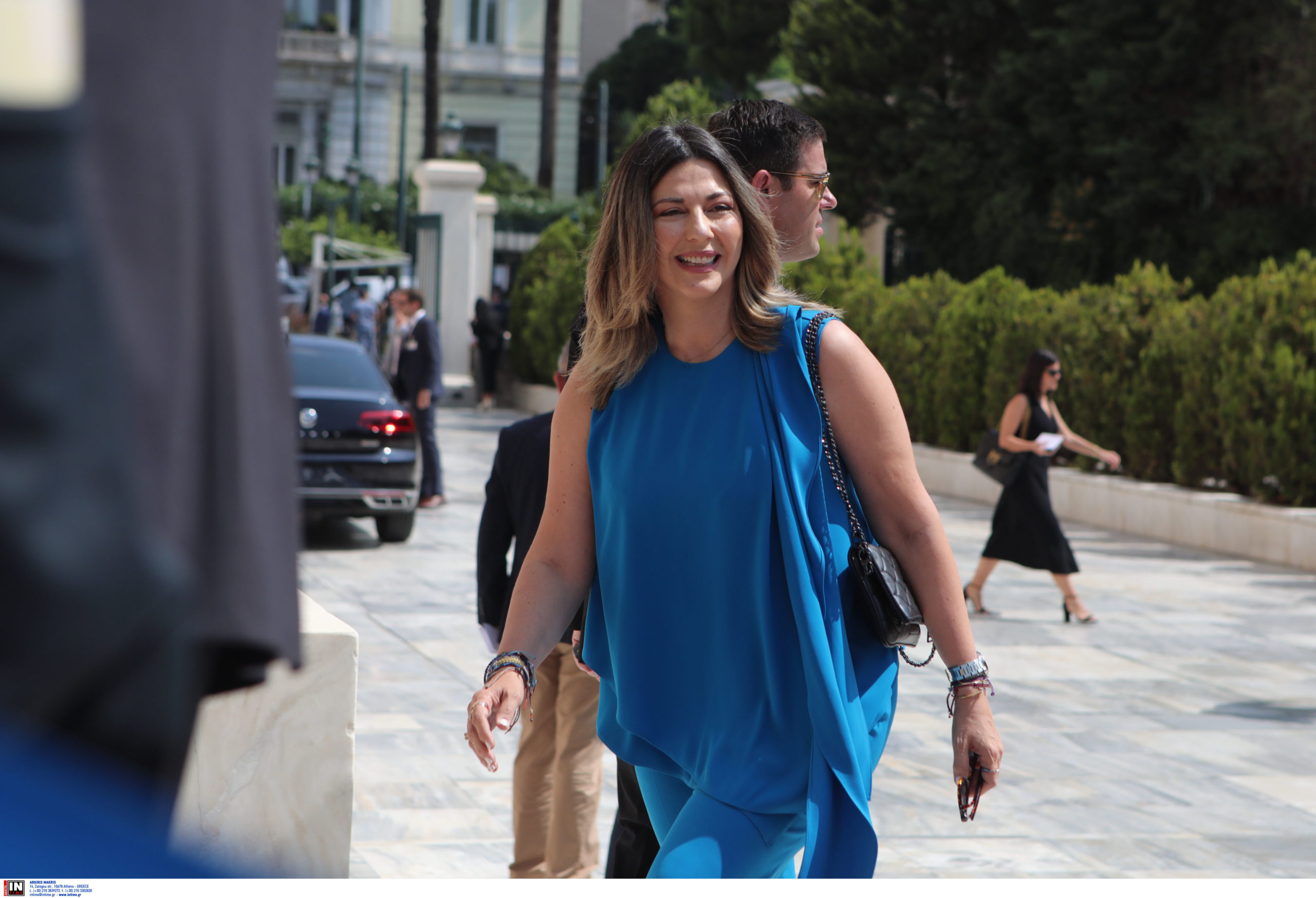 Έντονο μπλε φόρεμα και ασημί γόβες επέλεγε η βουλευτής της ΝΔ, Κωνσταντίνα Καραμπατσώλη.
