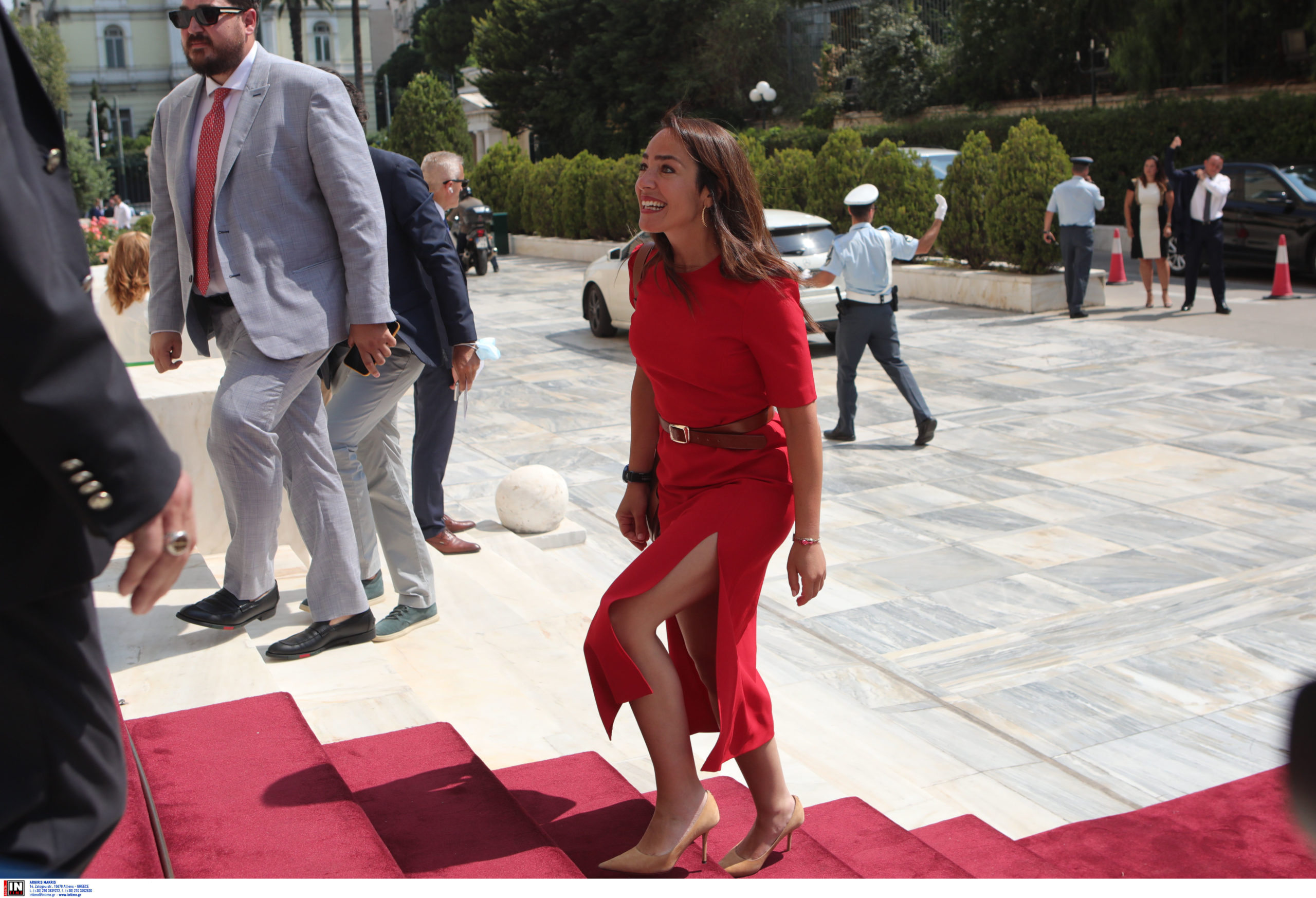 Η Δόμνα Μιχαηλίδου με το κόκκινο φόρεμά με τα εντυπωσιακά σκισίματα δέχθηκε αρκετά κοπλιμέντα. Οι γόβες και τα αξεσουάρ ήταν σε μπεζ και καφέ αποχρώσεις.