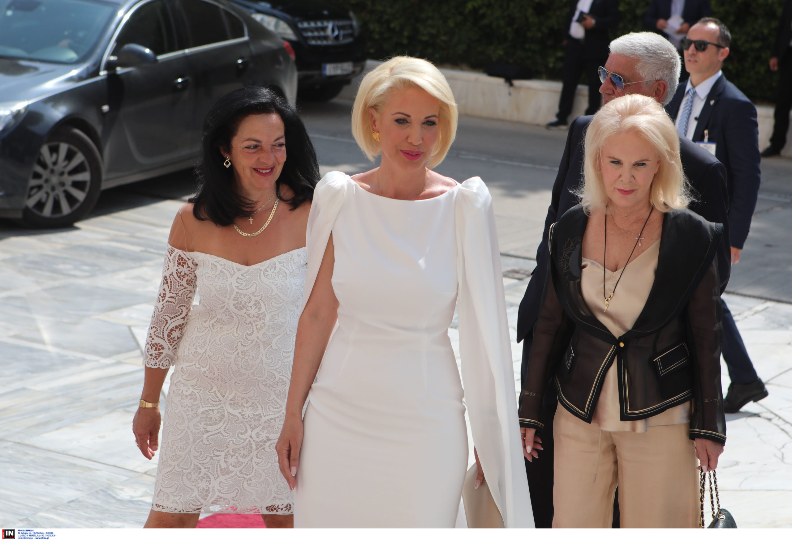 Η πάντα κομψή Ευγενία Μανωλίδου, επέλεξε το σκούρο μπλε χρώμα για την περίσταση και το συνδύασε με εντυπωσιακά ψηλοτάκουνα μπλε πέδιλα. Ο Άδωνις Γεωργιάδης μαζί με την σύζυγό του και τους δύο γιους τους φωτογραφήθηκαν στο περιστύλιο.