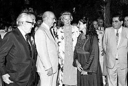 1982: Ο Γιάννης Αλευράς, πρόεδρος της Βουλής, ο Κωνσταντίνος Καραμανλής, η Μαργαρίτα Παπανδρέου, η Εύα Ζησιμίδου, πρώτη σύζυγος του Γιώργου Παπανδρέου, και ο κυβερνητικός εκπρόσωπος Δημήτρης Μαρούδας