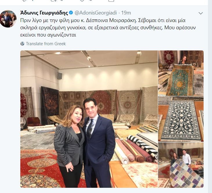 Ο Άδωνις Γεωργιάδης συναντήθηκε με την Δέσποινα Μοιραράκη και ανέβασε μάλιστα σχετική φωτογραφία στον προσωπικό του λογαριασμό στο Twitter. Ο αντιπρόεδρος της Νέας Δημοκρατίας έπλεξε το εγκώμιο της κ. Μοιραράκη γράφοντας: