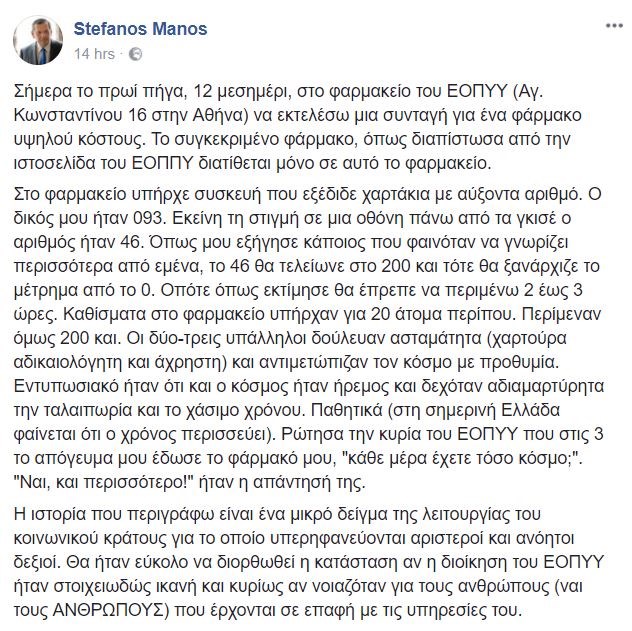 Ο κ. Μάνος, όπως αναφέρει, επισκέφτηκε χθες το μεσημέρι το φαρμακείο του ΕΟΠΥΥ στην οδό Αγίου Κωνσταντίνου στο κέντρο της Αθήνας για να εκτελέσει μια συνταγή. Στην συνέχεια, περιγράφει την ταλαιπωρία που έζησε και την οποία βιώνουν καθημερινά οι ασφαλισμένοι, τις τεράστιες ουρές που σχηματίζονται καθημερινά ενώ αναφέρεται και στην προσπάθεια των υπαλλήλων να τους εξυπηρετήσουν.