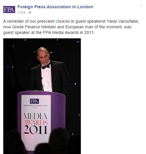 Η φωτογραφία του Γιάνη Βαρουφάκη με παπιγιόν αναρτήθηκε στη σελίδα στο facebook του Foreign Press Association.