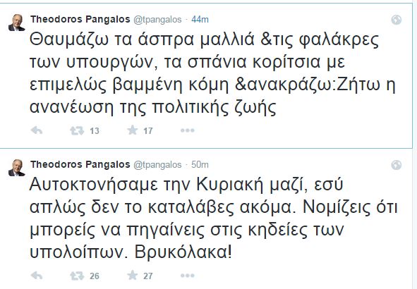 Σχολιάζοντας τις τρέχουσες πολιτικές εξελίξεις, ο κ. Πάγκαλος tweet-αρε: «Αυτοκτονήσαμε την Κυριακή μαζί, εσύ απλώς δεν το κατάλαβες ακόμα. Νομίζεις ότι μπορείς να πηγαίνεις στις κηδείες των υπολοίπων. Βρυκόλακα!».