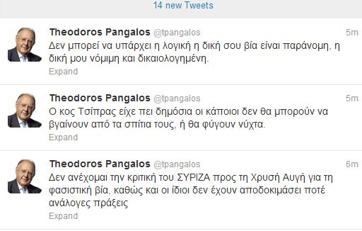 Ο Θεόδωρος Πάγκαλος επιτίθεται, μέσω twitter, στον Αλέξη Τσίπρα και τον ΣΥΡΙΖΑ, με αφορμή την επίθεση στον Δημήτρη Στρατούλη