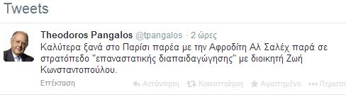 «Καλύτερα ξανά στο Παρίσι παρέα με την Αφροδίτη Αλ Σαλέχ παρά σε στρατόπεδο “επαναστατικής διαπαιδαγώγησης” με διοικητή Ζωή Κωνσταντοπούλου», ήταν το σχόλιο του Θεόδωρου Πάγκαλου.