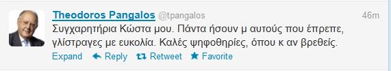 «Συγχαρητήρια Κώστα μου. Πάντα ήσουν μ αυτούς που έπρεπε,γλίστραγες με ευκολία. Καλές ψηφοθηρίες, όπου κ αν βρεθείς», έγραψε ο πρώην υπουργός.