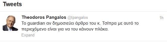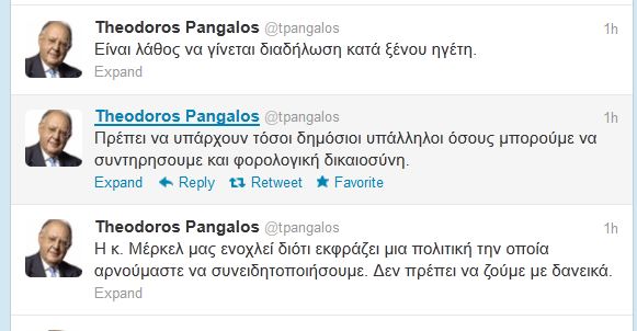 «Είναι λάθος να γίνεται διαδήλωση κατά ξένου ηγέτη», υποστηρίζει ο Θεόδωρος Πάγκαλος αναφερόμενος φυσικά στην Angela Merkel.«Η κ. Μέρκελ μας ενοχλεί διότι εκφράζει μια πολιτική την οποία αρνούμαστε να συνειδητοποιήσουμε. Δεν πρέπει να ζούμε με δανεικά», αναφέρει μέσα από τον προσωπικό του λογαριασμό στο Twitter.Ο κ. Πάγκαλος, ασχολήθηκε και με τον «αγαπημένο» του Αλέξη Τσίπρα. Ο πρώην υπουργός σχολίασε το άρθρο του προέδρου της ΚΟ του ΣΥΡΙΖΑ στην εφημερίδα Guardian ως εξής:«Το guardian αν δημοσιεύει άρθρο του κ. Τσίπρα με αυτό το περιεχόμενο είναι για να του κάνουν πλάκα».