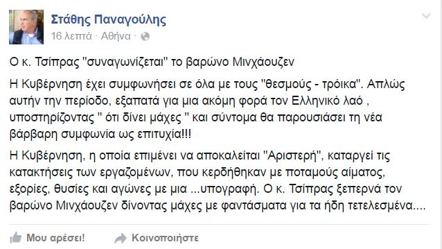 Επίθεση στον Πρωθυπουργό Αλέξη Τσίπρα, εξαπολύει ο ανεξάρτητος βουλευτής, Στάθης Παναγούλης, με ανάρτηση στον προσωπικό του λογαριασμό στο Facebook, επισημαίνοντας ότι «η κυβέρνηση έχει συμφωνήσει σε όλα με την τρόικα.