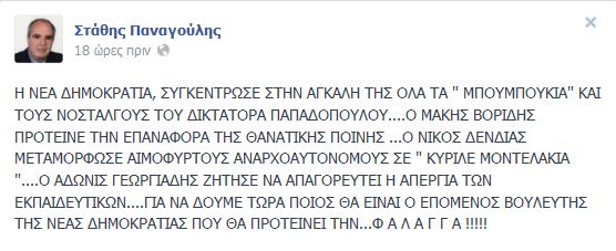 “Για να δούμε ποιος θα είναι ο επόμενος βουλευτής της Νέας Δημοκρατίας που θα προτείνει τη φάλαγγα!!!”, διερωτάται μέσω Facebook ο Στάθης Παναγούλης.