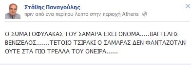 “Ο ΣΩΜΑΤΟΦΥΛΑΚΑΣ ΤΟΥ ΣΑΜΑΡΑ ΕΧΕΙ ΟΝΟΜΑ…..ΒΑΓΓΕΛΗΣ ΒΕΝΙΖΕΛΟΣ…….ΤΕΤΟΙΟ ΤΣΙΡΑΚΙ Ο ΣΑΜΑΡΑΣ ΔΕΝ ΦΑΝΤΑΖΟΤΑΝ ΟΥΤΕ ΣΤΑ ΠΙΟ ΤΡΕΛΛΑ ΤΟΥ ΟΝΕΙΡΑ……”, ήταν το σχόλιο του κ. Παναγούλη.