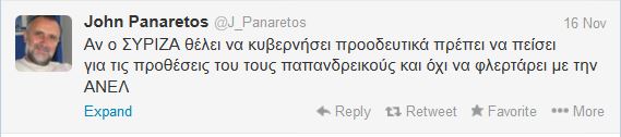 “Αν ο ΣΥΡΙΖΑ θέλει να κυβερνήσει προοδευτικά πρέπει να πείσει για τις προθέσεις του τους παπανδρεϊκούς και όχι να φλερτάρει με τους Ανεξάρτητους Έλληνες” έγραψε στο Twitter ο κ. Πανάρετος.