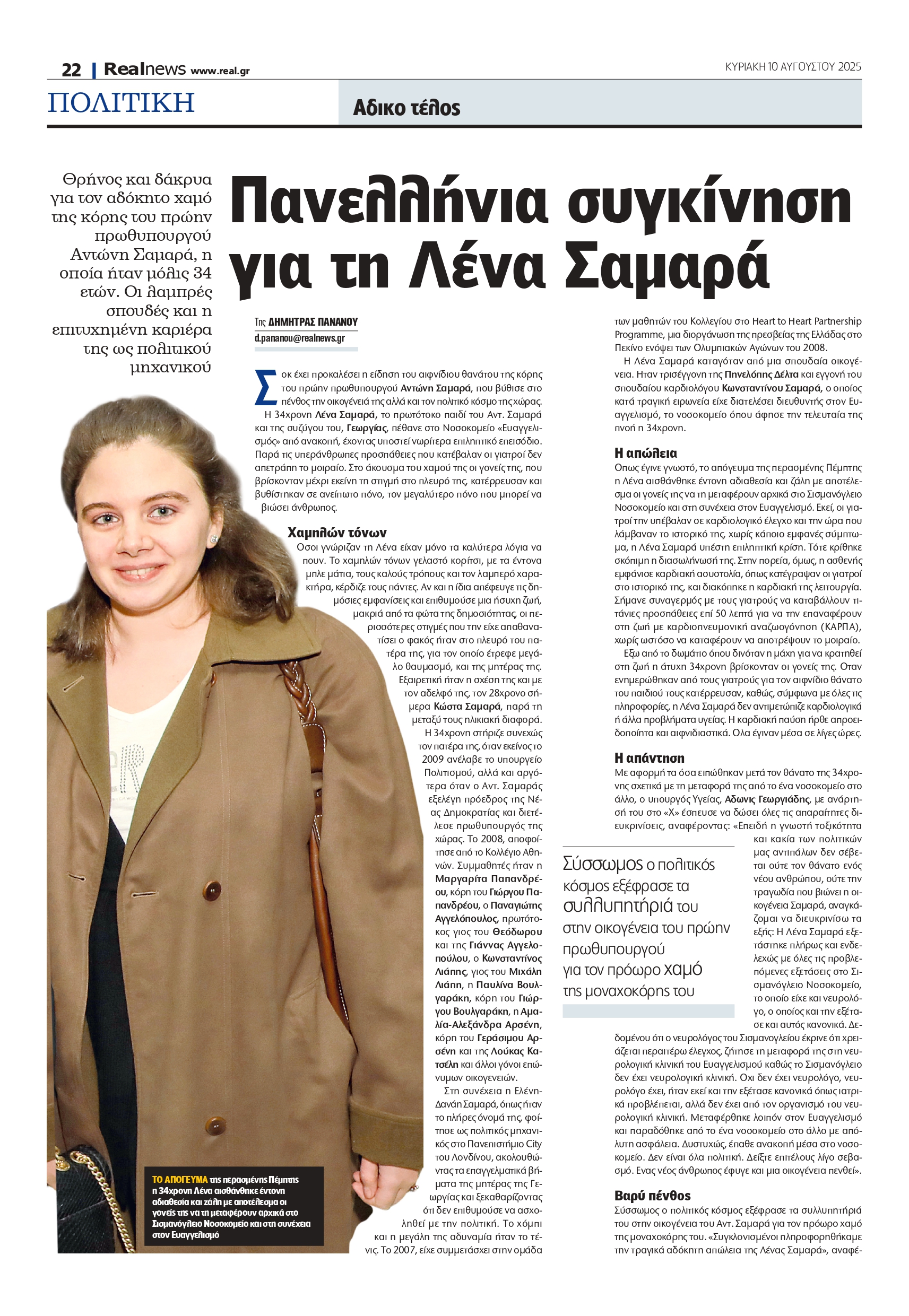 Σοκ έχει προκαλέσει η είδηση του αιφνίδιου θανάτου της κόρης του πρώην Πρωθυπουργού Αντώνη Σαμαρά, που βύθισε στο πένθος την οικογένειά της αλλά και τον πολιτικό κόσμο της χώρας. Η 34χρονη Λένα Σαμαρά, το πρωτότοκο παιδί του Αντ. Σαμαρά και της συζύγου του, Γεωργίας, πέθανε στο Νοσοκομείο «Ευαγγελισμός» από ανακοπή, έχοντας υποστεί νωρίτερα επιληπτικό επεισόδιο. Παρά τις υπεράνθρωπες προσπάθειες που κατέβαλαν οι γιατροί δεν απετράπη το μοιραίο. Στο άκουσμα του χαμού της οι γονείς της, που βρίσκονταν μέχρι εκείνη τη στιγμή στο πλευρό της, κατέρρευσαν και βυθίστηκαν σε ανείπωτο πόνο, τον μεγαλύτερο πόνο που μπορεί να βιώσει άνθρωπος. Σήμερα το μεσημέρι θα πραγματοποιηθεί η κηδεία της.
