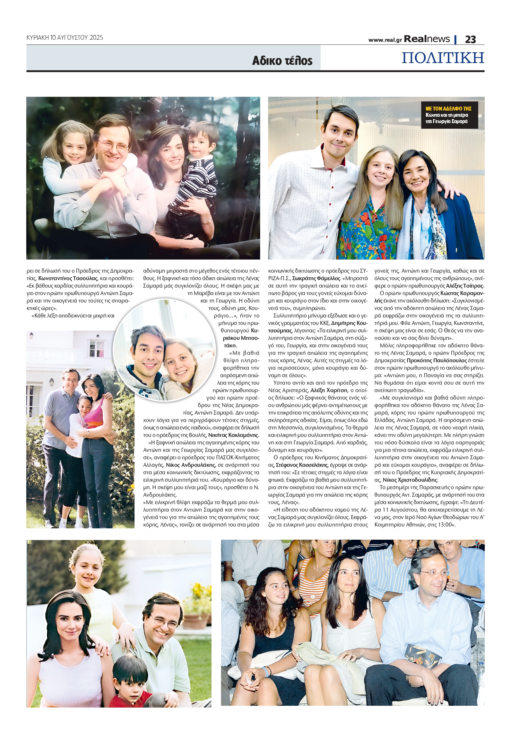«Η ξαφνική απώλεια της αγαπημένης κόρης του Αντώνη και της Γεωργίας Σαμαρά μας συγκλόνισε», αναφέρει ο πρόεδρος του ΠΑΣΟΚ-Κινήματος Αλλαγής, Νίκος Ανδρουλάκης, σε ανάρτησή του στα μέσα κοινωνικής δικτύωσης, εκφράζοντας τα ειλικρινή συλλυπητήριά του. «Κουράγιο και δύναμη. Η σκέψη μου είναι μαζί τους», προσθέτει ο Ν. Ανδρουλάκης. «Με ειλικρινή θλίψη εκφράζω τα θερμά μου συλλυπητήρια στον Αντώνη Σαμαρά και στην οικογένειά του για την απώλεια της αγαπημένης τους κόρης, Λένας», τονίζει σε ανάρτησή του στα μέσα κοινωνικής δικτύωσης ο πρόεδρος του ΣΥΡΙΖΑ-Π.Σ., Σωκράτης Φάμελλος. «Μπροστά σε αυτή την τραγική απώλεια και το ανείπωτο βάρος για τους γονείς εύχομαι δύναμη και κουράγιο στον ίδιο και στην οικογένειά του», συμπληρώνει.