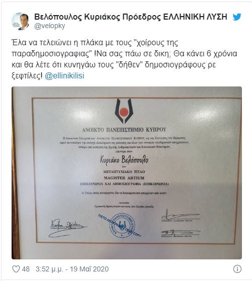 Όπως αναφέρει σε ανακοίνωσή του το Πανεπιστήμιο Κύπρου: “Έχει περιέλθει στην αντίληψή μας ότι το μέλος του Ελληνικού Κοινοβουλίου κ. Κυριάκος Βελόπουλος φέρεται να έχει λάβει το 2013 από το Πανεπιστήμιο Κύπρου πτυχίο με ειδίκευση στην Ιστορία, Αρχαιολογία και τον Ελληνικό Πολιτισμό και το 2016 μεταπτυχιακό τίτλο με ειδίκευση στην Επικοινωνία και Νέα Δημοσιογραφία. Το Πανεπιστήμιο Κύπρου διευκρινίζει ότι ο κ. Κυριάκος Βελόπουλος ουδέποτε υπήρξε φοιτητής του και βεβαίως δεν έχει πάρει πτυχίο ή/και μεταπτυχιακό τίτλο από το Πανεπιστήμιο Κύπρου”.