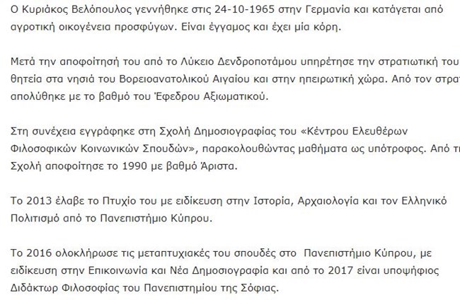 Στην επίσημη ιστοσελίδα του Κυριάκου Βελόπουλου, διαβάζοντας το βιογραφικό του υπάρχει η παρακάτω αναφορά: “Το 2013 έλαβε το Πτυχίο του με ειδίκευση στην Ιστορία, Αρχαιολογία και τον Ελληνικό Πολιτισμό από το Πανεπιστήμιο Κύπρου. Το 2016 ολοκλήρωσε τις μεταπτυχιακές του σπουδές στο Πανεπιστήμιο Κύπρου, με ειδίκευση στην Επικοινωνία και Νέα Δημοσιογραφία και από το 2017 είναι υποψήφιος Διδάκτωρ Φιλοσοφίας του Πανεπιστημίου της Σόφιας.”. Ενώ το ίδιο και στο βιογραφικό του που έχει αναρτηθεί στην επίσημη ιστοσελίδα της Βουλής.
