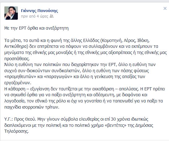 Tο κλείσιμο της ΕΡΤ σχολιάζει ο βουλευτής της ΔΗΜΑΡ Γιάννης Πανούσης στην σελίδα του στο Facebook.