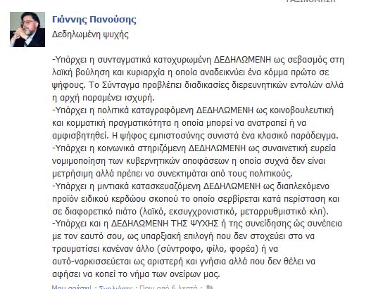 Ένα αινιγματικό κείμενο ανήρτησε στo προφίλ του στο Facebook ο βουλευτής της ΔΗΜΑΡ Γιάννης Πανούσης, τονίζοντας ότι εκτός από την συνταγματικά κατοχυρωμένη, την πολιτικά καταγραφόμενη, την κοινωνικά στηριζόμενη και τη μιντιακά κατασκευαζόμενη δεδηλωμένη,υπάρχει και η δεδηλωμένη της ψυχής.