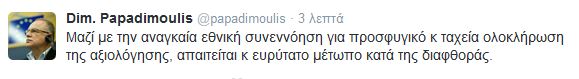 O κ.Παπαδημούλης έγραψε στο Twitter: «Μαζί με την αναγκαία εθνική συνεννόηση για προσφυγικό και ταχεία ολοκλήρωση της αξιολόγησης, απαιτείται και ευρύτατο μέτωπο κατά της διαφθοράς».