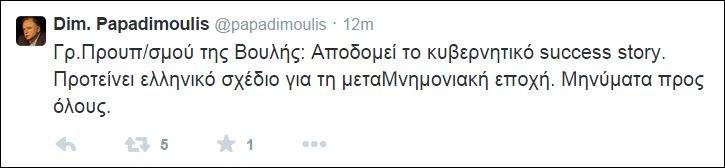 “Γρ. Προϋπολογισμού της Βουλής: Αποδομεί το κυβερνητικό success story. Προτείνει ελληνικό σχέδιο για τη μεταΜνημονιακή εποχή. Μηνύματα προς όλους”, σχολίασε χαρακτηριστικά ο κ. Παπαδημούλης στον προσωπικό του λογαριασμό στο twitter.