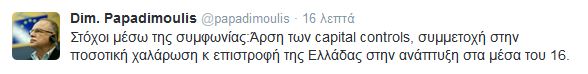 Ο κ.Παπαδημούλης έγραψε στο Twitter: «Στόχοι μέσω της συμφωνίας: Άρση των capital controls, συμμετοχή στην ποσοτική χαλάρωση και επιστροφή της Ελλάδας στην ανάπτυξη στα μέσα του 2016».
