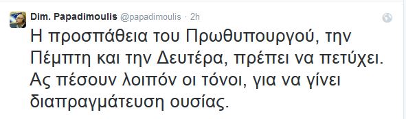 Τη συνάντηση που θα έχει ο Πρωθυπουργός, Αλέξης Τσίπρας, την Πέμπτη, στις Βρυξέλλες, με τους Ευρωπαίους εταίρους, σχολίασε ο ευρωβουλευτής, Δημήτρης Παπαδημούλης, μέσω του προσωπικού του λογαριασμού στο Twitter, επισημαίνοντας ότι πρέπει να πέσουν οι τόνοι. Αναλυτικά ο κ. Παπαδημούλης, έγραψε: «Η προσπάθεια του Πρωθυπουργού, την Πέμπτη και την Δευτέρα, πρέπει να πετύχει. Ας πέσουν λοιπόν οι τόνοι, για να γίνει διαπραγμάτευση ουσίας».
