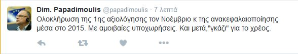 Με μήνυμα του στο Twitter, κ.Παπαδημούλης αναφέρει χαρακτηριστικά: «Ολοκλήρωση της πρώτης αξιολόγησης τον Νοέμβριο και της ανακεφαλαιοποίησης μέσα στο 2015. Με αμοιβαίες υποχωρήσεις. Και μετά, “γκάζι” για το χρέος».