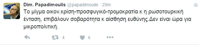 «Το μίγμα οικον.κρίση-προσφυγικό-τρομοκρατία κ η ρωσοτουρκική ένταση, επιβάλουν σοβαρότητα κ αίσθηση ευθύνης. Δεν είναι ώρα για μικροπολιτική», έγραψε χαρακτηριστικά στον προσωπικό του λογαριασμό στο twitter, ο αντιπρόεδρος του Ευρωπαϊκού Κοινοβουλίου.