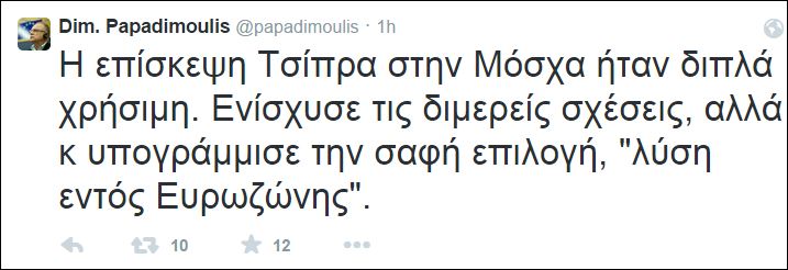 “Η επίσκεψη Τσίπρα στην Μόσχα ήταν διπλά χρήσιμη. Ενίσχυσε τις διμερείς σχέσεις, αλλά και υπογράμμισε την σαφή επιλογή, “λύση εντός Ευρωζώνης”, σχολίασε χαρακτηρισικά στον προσωπικό του λογαριασμό στο twitter, ο ευρωβουλευτής του ΣΥΡΙΖΑ και αντιπρόεδρος του ευρωπαϊκού κοινοβουλίου, Δημήτρης Παπαδημούλης.