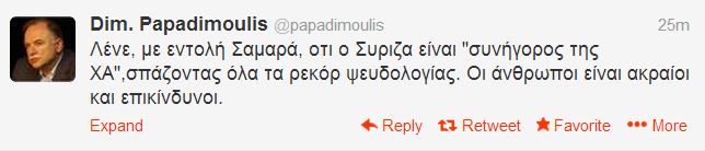 “Λένε, με εντολή Σαμαρά, ότι ο Συριζα είναι “συνήγορος της Χα’,σπάζοντας όλα τα ρεκόρ ψευδολογίας. Οι άνθρωποι είναι ακραίοι και επικίνδυνοι”, έγραψε χαρακτηριστικά στον προσωπικό του λογαριασμό στο twitter, o Δημήτρης Παπαδημούλης.