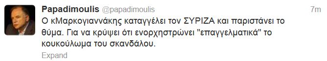 “Ο κ. Μαρκογιαννάκης καταγγέλλει τον ΣΥΡΙΖΑ και παριστάνει το θύμα”, σχολιάζει στο twitter ο Δημήτρης Παπαδημούλης με αφορμή την “διακαναλική” κόντρα μεταξύ της Ζωής Κωνσταντοπούλου και του Χρήστου Μαρκογιαννάκη.