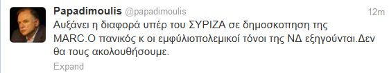 “Πανηγυρίζει”, μέσω twitter, ο Δημήτρης Παπαδημούλης για την αύξηση του ΣΥΡΙΖΑ (30,4%) σε δημοσκόπηση της Marc.