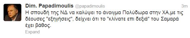 «Η σπουδή της ΝΔ να καλύψει το άνοιγμα Πολύδωρα στην ΧΑ, με τις δέουσες “εξηγήσεις”, δείχνει ότι το “κλίνατε επι δεξιά” του Σαμαρά έχει βάθος», ήταν το σχόλιο που έκανε ο Δ. Παπαδημούλης, στον προσωπικό του λογαριασμό στο twitter.