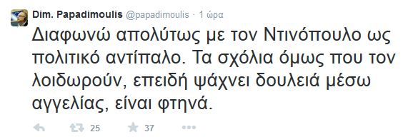 Τη στήριξη του στον Αργύρη Ντινόπουλο, με αφορμή την αγγελία για εύρεση εργασίας, εξέφρασε ο ευρωβουλευτής του ΣΥΡΙΖΑ, Δημήτρης Παπαδημούλης, μέσω του προσωπικού του λογαριασμού στο Twitter. Συγκεκριμένα, ο κ. Παπαδημούλης, έγραψε: «Διαφωνώ απολύτως με τον Ντινόπουλο ως πολιτικό αντίπαλο. Τα σχόλια όμως που τον λοιδορούν, επειδή ψάχνει δουλειά μέσω αγγελίας, είναι φτηνά».